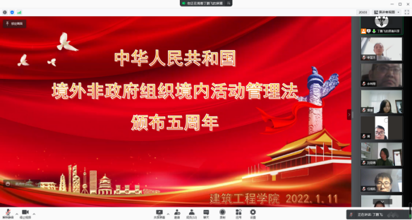 为了增强师生法律意识和国家安全意识,按照河南省教育厅《关于组织开展<境外非政府组织境内活动管理法>实施五周年普法宣传周活动的通知》和学校有关工作要求,2022年1月11日,建筑工程学院党总支利用线上腾讯会议的形式组织全体教职工学习了《中华人民共和国境外非政府组织境内活动管理法》,会议由学院党总支书记马春燕主持。