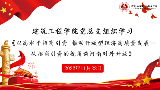 2022年11月22日下午,建筑工程学院党总支组织全体教师在办公楼516党员活动室学习“十大战略”系列课程之《以高水平招商引资 推动开放型经济高质量发展—从招商引资的视角谈河南对外开放》,本次学习采取东西校区视频连线,线上、线下相结合的方式,会议由建筑工程学院党总支书记马春燕主持,院长张虎及全体教职工参加会议。