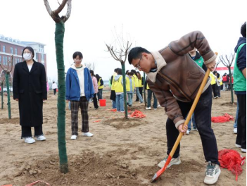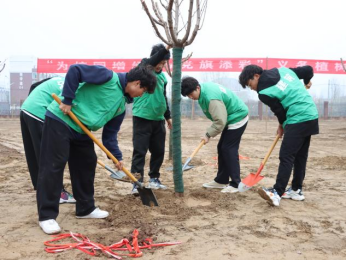 植树现场,大家热情高涨,找准点位、刨坑下苗、掩土浇水,师生携手,分工协作,认真细致地完成每一道植树工序。种下一棵树苗,收获无限希望;栽下一片新绿,汇聚万千力量。植树过程中,魏新华校长仔细叮嘱全体师生:一是要加强苗木管护,努力提高成活率,确保栽一棵苗木、成一片绿意、美一方天地。二是要培养吃苦耐劳的精神,多参与劳动实践,在实践中体会劳动的艰辛,感受劳动的快乐。三是要增强环保意识,主动践行习近平生态文明思想,贯彻绿水青山就是金山银山的理念,践行绿色低碳生活方式,做德智体美劳全面发展的社会主义建设者和接班人。