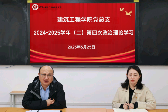 2025年3月25日下午,建筑工程学院党总支于开封校区北院F107教室开展政治理论学习活动,本次学习由建筑工程学院党总支书记张虎主持,全体教职工参与。