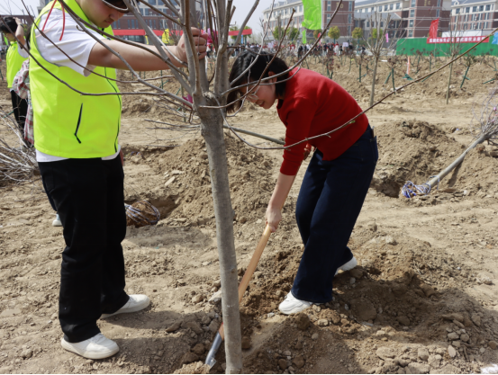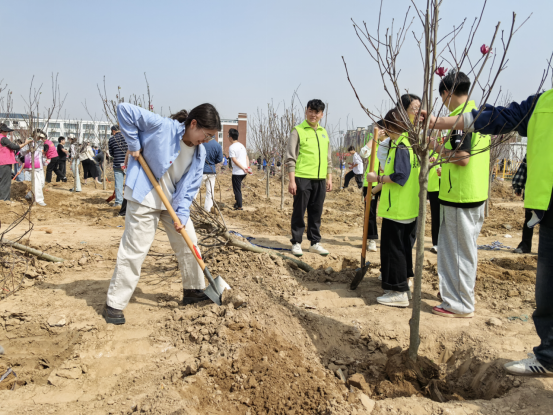 活动现场,在党总支书记张虎简要介绍活动意义与流程后,大家迅速投入到植树工作中。党员教师们和入党积极分子们热情高涨,分工明确,密切协作。大家手持工具,干劲十足,党员教师们充分发挥模范带头作用,熟练地挥锹铲土、扶苗培土、提水浇灌,每一个环节都认真细致、一丝不苟。在大家齐心协力的努力下,一棵棵树苗扎根在校园的土地上,在微风中摇曳生姿,展现出蓬勃的生命力,形成了一片充满生机的“党员先锋林”。