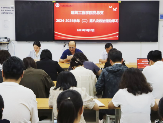 2025年5月20日下午,建筑工程学院党总支于开封校区北院F107教室开展政治理论学习活动,本次学习由建筑工程学院党总支书记张虎主持,院长李勇,党总支副书记刘亚娟及全体教职工参加。
