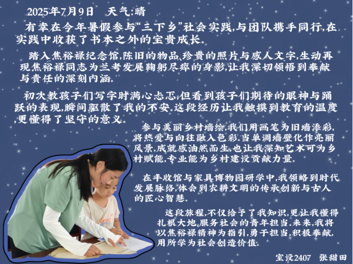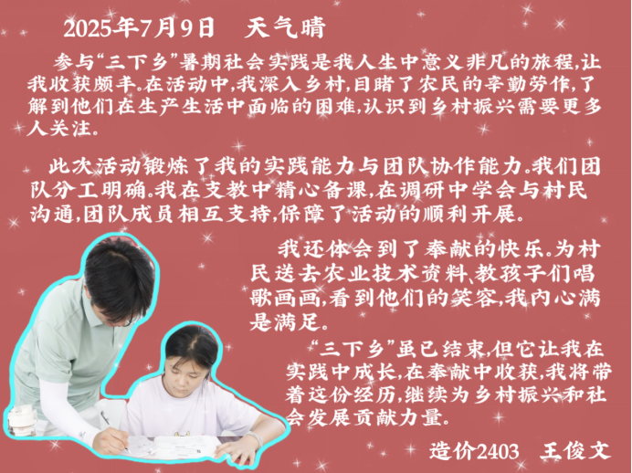 这些文字里,有对焦裕禄精神的共鸣,有对专业实践的顿悟,更有对乡村振兴的热忱。“三下乡”的旅程虽已结束,但它在队员们心中种下的“扎根土地、服务人民”的种子,终将在未来的学习与实践中生根发芽。正如他们所坚信的,最好的成长,是把青春写在祖国需要的地方——这份从实践中汲取的力量,定会指引他们在“建证美好中国”的路上,走得更稳、更远。