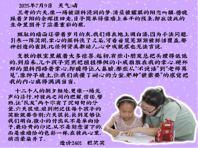 近日,建筑工程学院“小筑”志愿服务队暑期“三下乡”社会实践圆满落幕。从焦裕禄纪念馆的精神洗礼到庙台村的支教墙绘,从博物馆的研学悟道到田间地头的实践感悟,队员们在乡土间收获了成长,更沉淀了诸多真挚感悟。让我们一起来听听大家的感受吧。