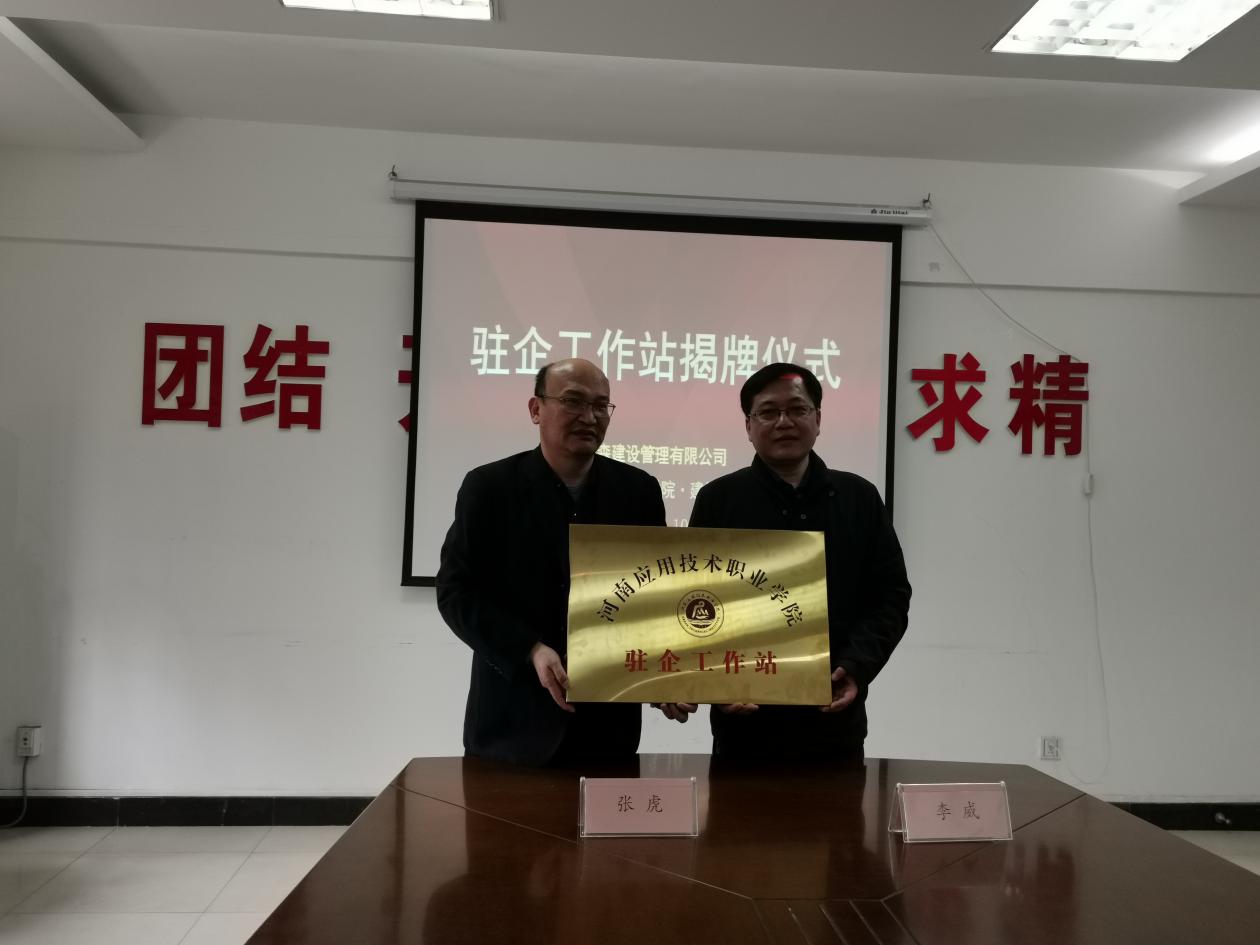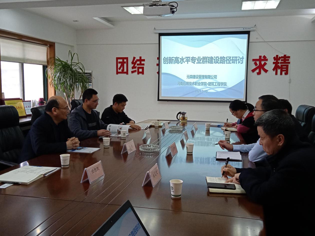 为进一步深化校企合作,加强双师教师培养、推进专业群建设及“三教”改革,培养合格专业技能人才。建筑工程学院院长张虎、办公室主任樊磊、教务办主任任旭凯、就业专员宋春磊等一行4人,在3月10日上午来到河南元森建设管理有限公司,出席驻企工作站签约及挂牌仪式,并参加深化校企合作产教融合研讨会。河南元森建设管理有限公司董事长李威、副总经理范建伟、赵文义、人事部经理李燕飞等企业领导出席。