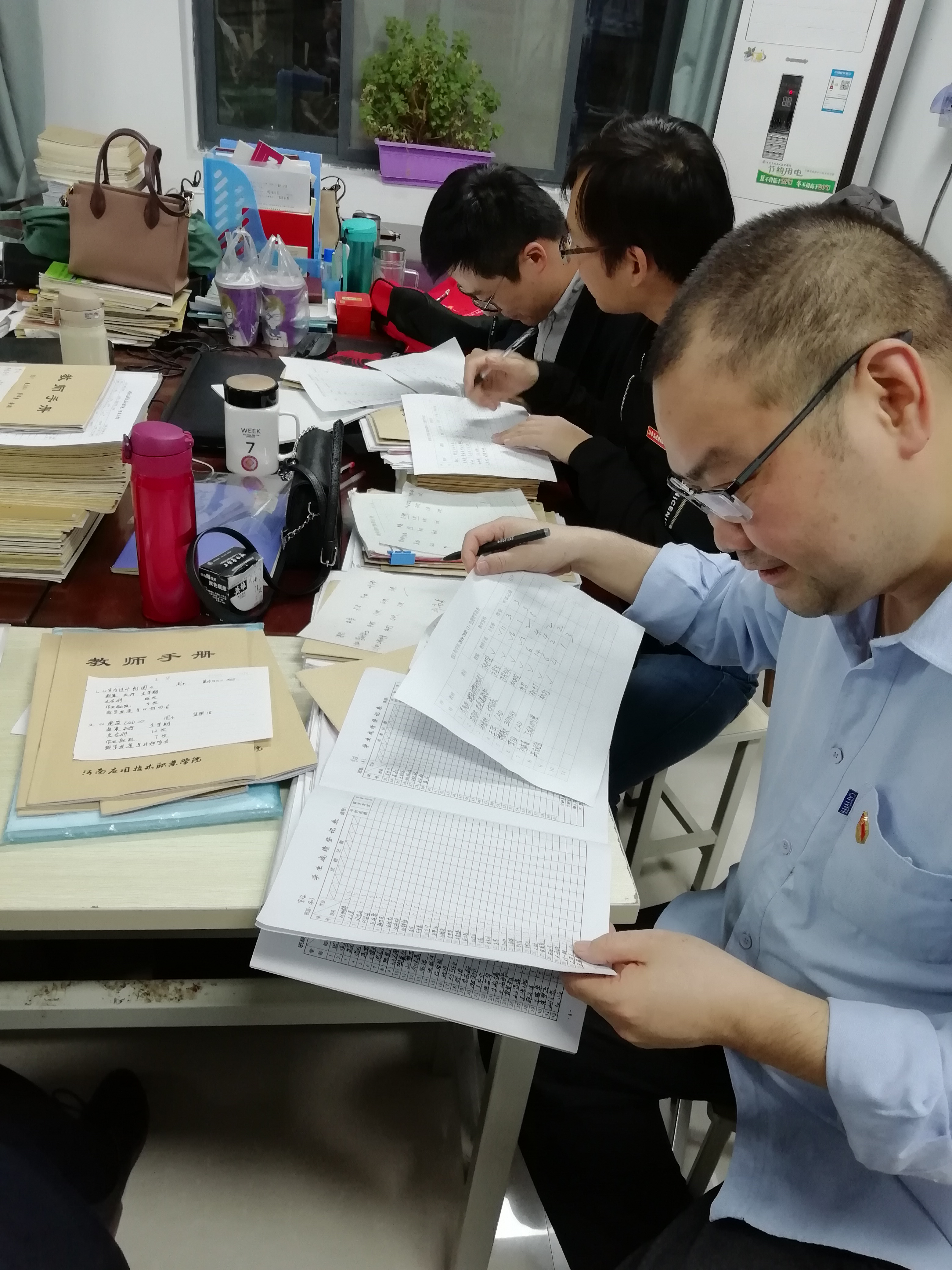 首先,院长张虎向大家通报了10月23日范校长召开教学工作会议的有关事项,要求大家熟知学校未来总体发展方向,围绕学院中心工作,包括在专业建设发展、实训室建设、教师培训、课堂教学质量、技能竞赛、在线课程建设等方面。接着,两个教研室的老师开始对教案、作业等互相检查,互相评比探讨学习。