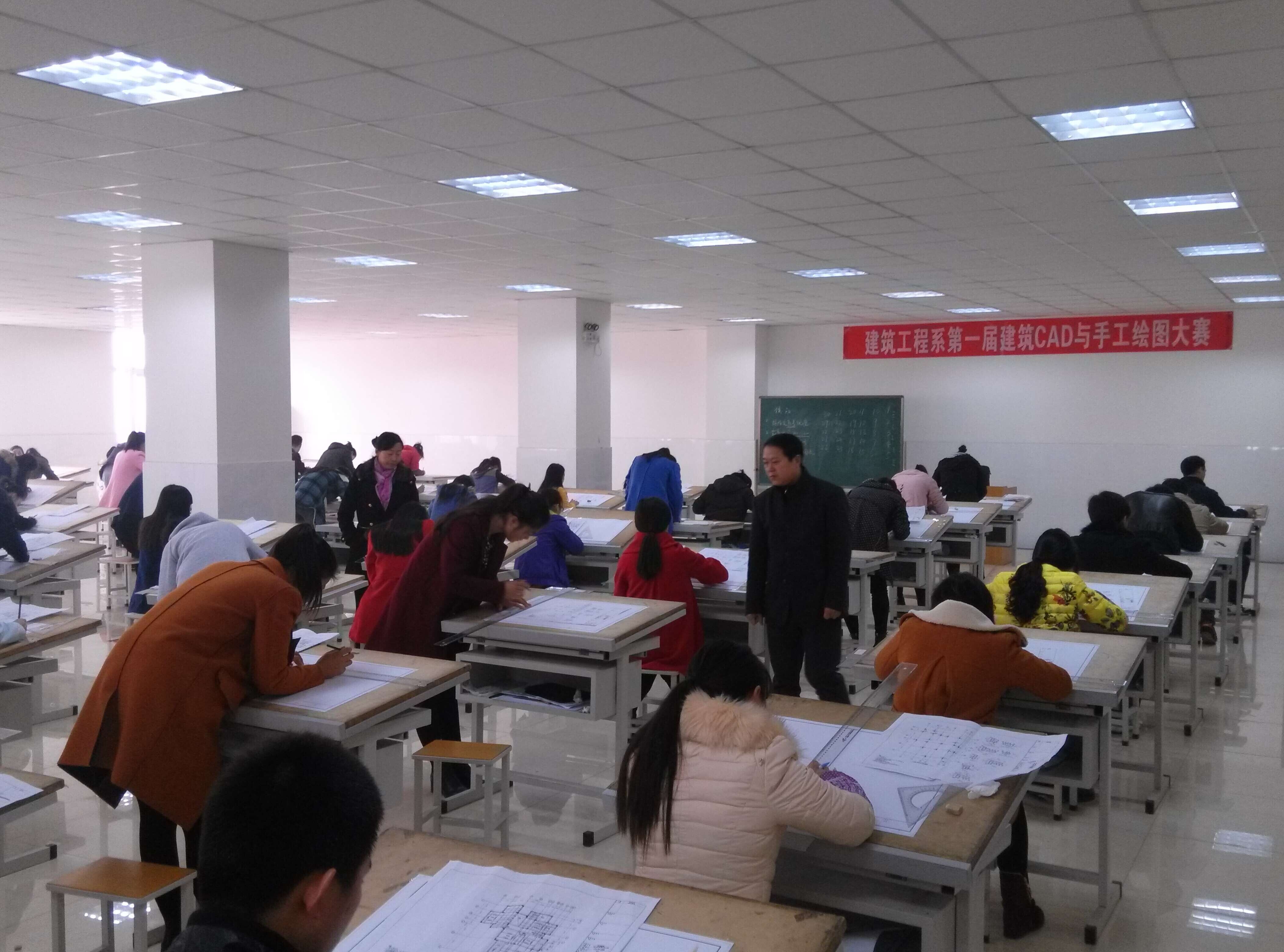 为了进一步丰富校园生活,增添大学生活的乐趣,提升学生们的自我创作能力,开拓学生的空间思维,加强我系学生专业课知识的交流,扩大学生的图学知识面,提高大学生计算机绘图的能力,建筑工程系举办首届AutoCAD与手工绘图大赛。本次大赛于2014年11月22日举行,共有180余名同学参加比赛,分为30小组,内容分为计算机操作绘图,与图纸手工绘图,其中计算机绘图在E425教室进行,手工绘图于E613教室进行。