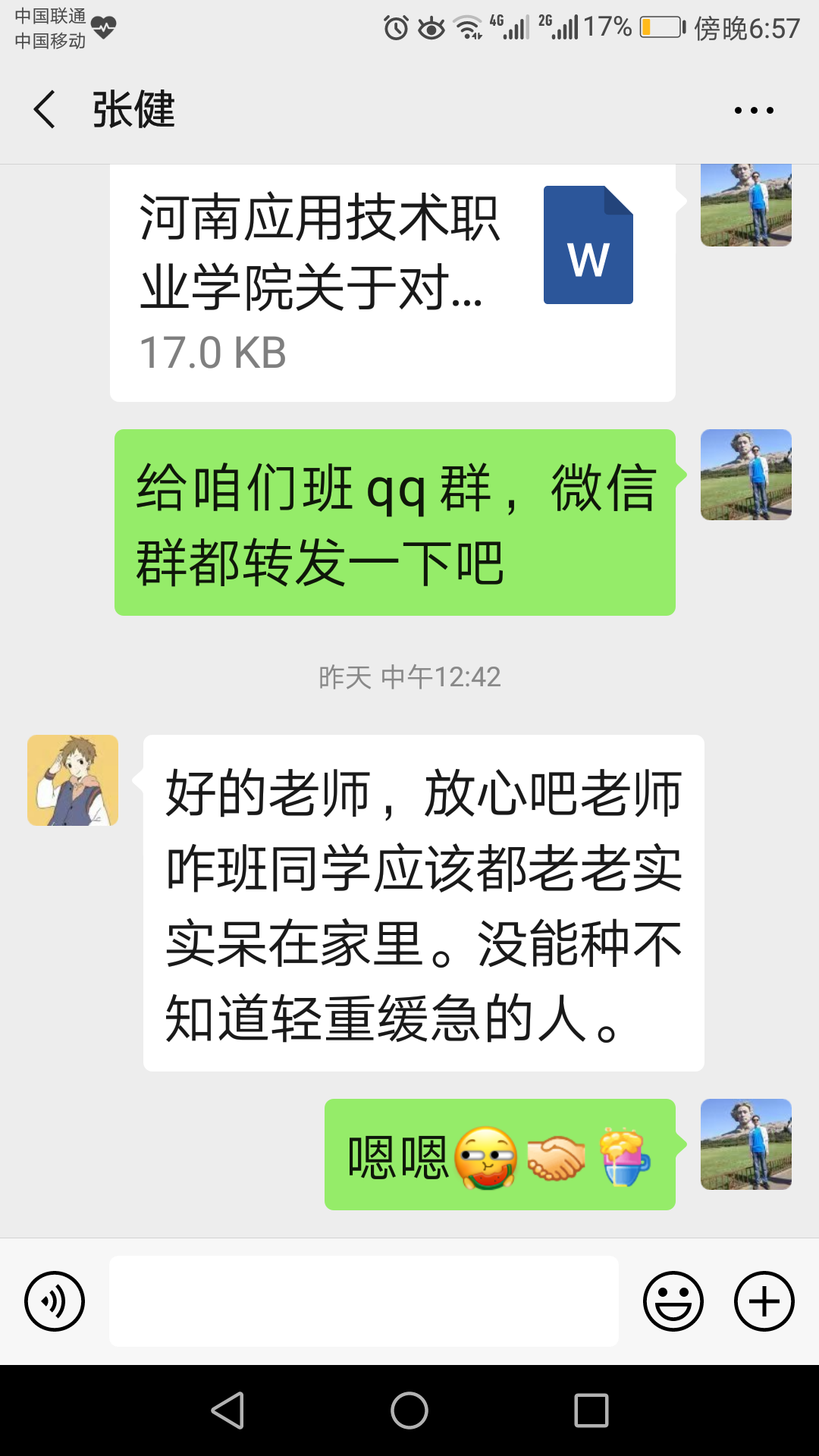 我校建筑工程学院的辅导员们按照学校和马春燕书记的工作部署要求,勇担使命,竭尽所能,尽献微光。他们作为一线战“疫”员,忙碌在自己的工作岗位上,密切关注、关心学生近况。认真落实好“日报告、零报告”制度,建立了本班疫情防控学生信息台账,每日摸排学生状况、统计上报疫情数据、每日问候湖北学生、每日在班级群第一时间转发分享疫情变化和相关时事新闻,提醒班级同学做好疫情防护工作,对学生进行思想引导和心理疏导,与学生沟通缓解紧张情绪,与家长联系争取工作支持。对网上恶意传播和扭曲疫情信息所造成的恐慌等现象,积极发声,及时辟谣,教育同学们不信谣、不传谣,宣传合理的防疫措施,让学生认识到每个人都是自身健康的第一责任人,务必做好自我防护。