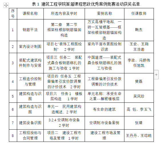 根据《中共河南省委办公厅印发<关于在全省开展“能力作风建设年”活动的实施方案>的通知》(豫办[2021]36号)《中共河南省委高校工委印发<关于河南省高校“能力作风建设年”活动实施方案>的通知》(豫高发[2021]164号)和中共河南省委教育工委、河南省教育厅“能力作风建设年”活动领导小组办公室印发《关于深入开展“大学习大培训大练兵大提升”活动的通知》等相关文件精神,建筑工程学院响应学校号召,开展了课程思政案例征集评比活动,老师们踊跃参加,共上交24份案例,学院组织评审小组,评选出一等奖3名,二等奖7名,三等奖14名。