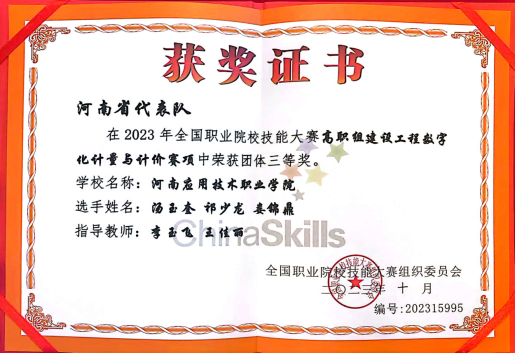 2023年10月28日,由教育部等36个部门主办的2023年全国职业院校技能大赛高职组“建设工程数字化计量与计价”赛项在青海建筑职业技术学院举行,来自全国32个省、市、自治区的76支代表队参与角逐,经过激烈比拼,我校建筑工程学院学生汤玉奎、祁少龙、娄锦鼎组成的代表队荣获全国团体三等奖。