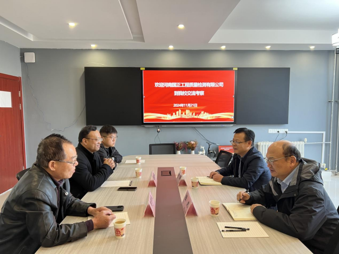 为积极响应国家政策,推动产教融合,2024年11月21日上午,河南国正工程质量检测有限公司领导贾清苏、刘志伟一行莅临我院交流考察,会议在教学楼F205进行。建筑工程学院党总支书记张虎、院长李勇出席活动,双方旨在通过深入交流与合作,共同探索人才培养新模式,推动建设工程全生命周期智慧检测产业学院的发展。