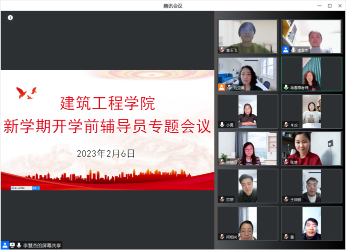 暖雨晴风初破冻,寒假悄然而去,新学期的画卷正徐徐铺开。为更好地迎接新学期的到来,确保学院开学后各项工作有序、规范地开展,2023年2月6日,建筑工程学院线上召开了2022—2023学年第二学期开学前辅导员专题会议。会议由党总支书记马春燕主持,党总支副书记刘亚娟和全体专兼职辅导员参加。