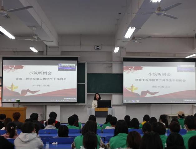 为提高学生干部积极性、主动性以及学生干部的综合素质,为学生提供更好的服务。2023年3月13日中午,建筑工程学院在郑州校区B102教室召开了第五周学生干部例会(开封校区以视频形式在C101教室参加会议)。会议由建筑工程学院党总支副书记刘亚娟主持,辅导员李慧杰、宋春磊、李政、张慧以及学生会成员,各班班长、副班长和团支书参加此次会议。
