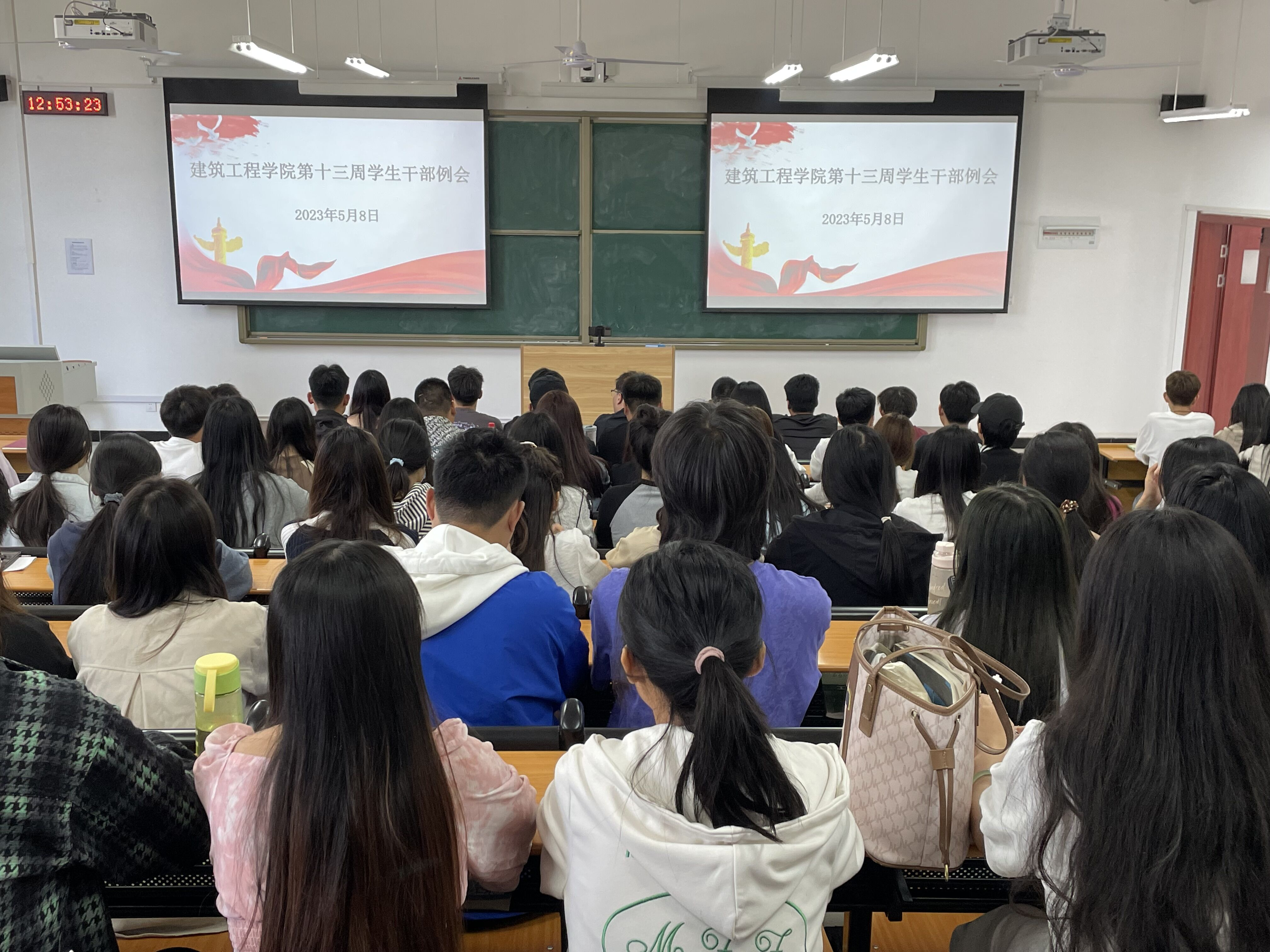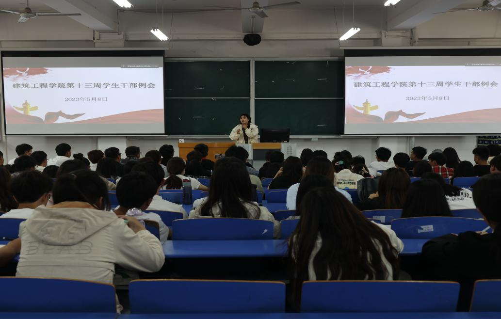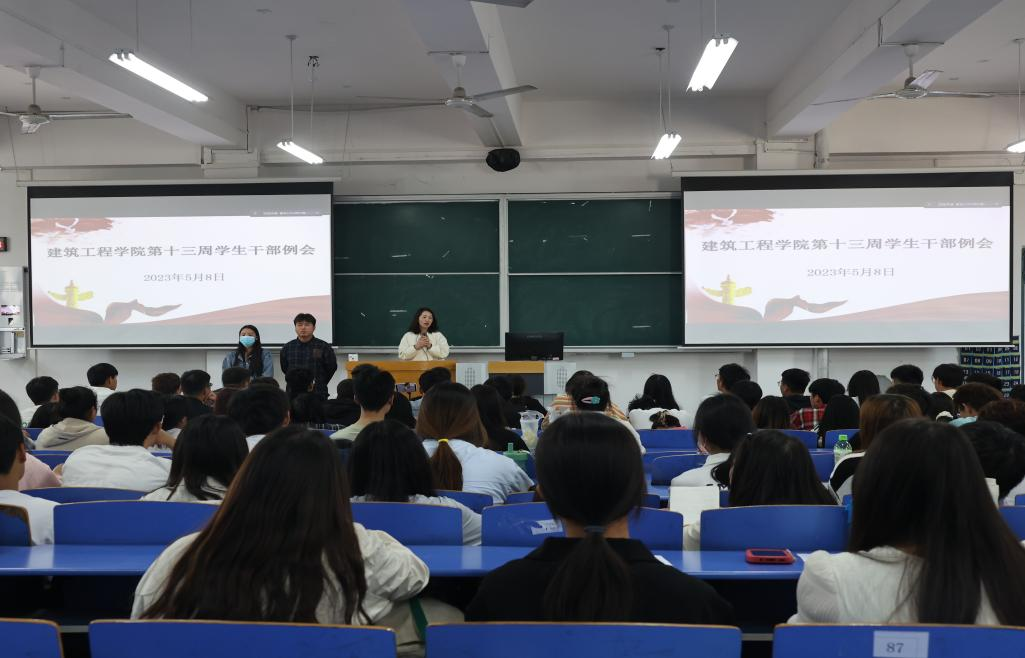 为提高学生干部积极性、主动性以及学生干部的综合素质,为学生提供更好的服务。2023年5月8日中午,建筑工程学院在郑州校区B201教室召开了第十三周学生干部例会(开封校区以视频形式在C101教室参加会议)。会议由建筑工程学院辅导员李慧杰主持,党总支副书记刘亚娟,辅导员李政、宋春磊、李玉飞、闫相向以及21级、22级学生会全体成员、入党积极分子、各班班长、团支书和生活委员参加。