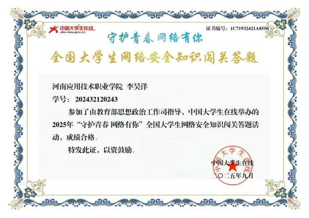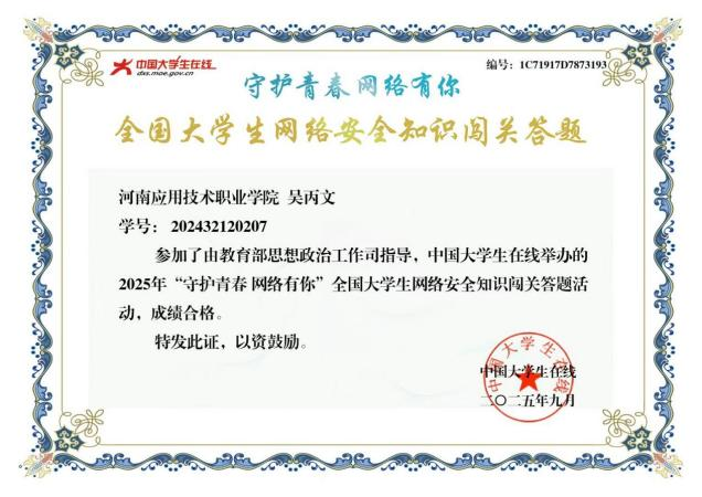 各班级开展“网络安全伴我行”主题班会,通过采用案例研讨、角色扮演等形式,让学生在参与中增强了风险应对能力。同时,学院组织学生参与“2025年全国大学生网络安全知识竞答”活动,以赛促学,以学促用。值得一提的是,学院推广使用的“AI护校园”智能防护系统,为师生提供了实时、智能的网络行为安全支持,有效提升了校园网络安全的整体防护水平。