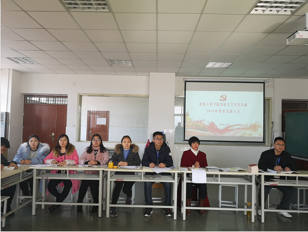 2018年12月18日11:00建筑工程学院党总支学生党支部于实训楼E311顺利召开了预备党员发展大会。建筑工程学院党总支书记马春燕同志、学生党支部组织委员任旭凯、学生党支部宣传委员刘亚娟、学生党支部刘高喜同志、吴凤珍同志、王丹丹同志、李慧杰同志八人参加本次会议,党总支纪委委员樊磊、教工党支部冯娇伟同志、张瑾同志列席本次大会,会议主题:建筑工程学院党总支学生党支部2018年接收31名申请人为预备党员的会议。