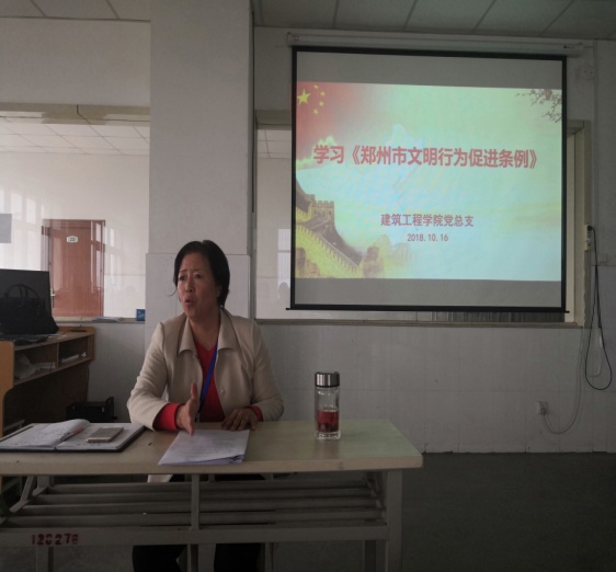 根据学校的工作安排,2018年10月16日下午3:30,在E311建筑工程学院全体专兼职教师和行政人员在总支书记马春燕的带领下,认真学习了郑州市文明行为促进条例。
