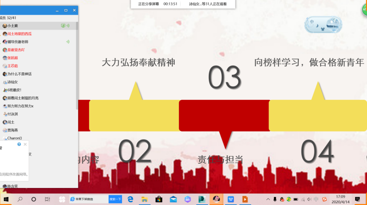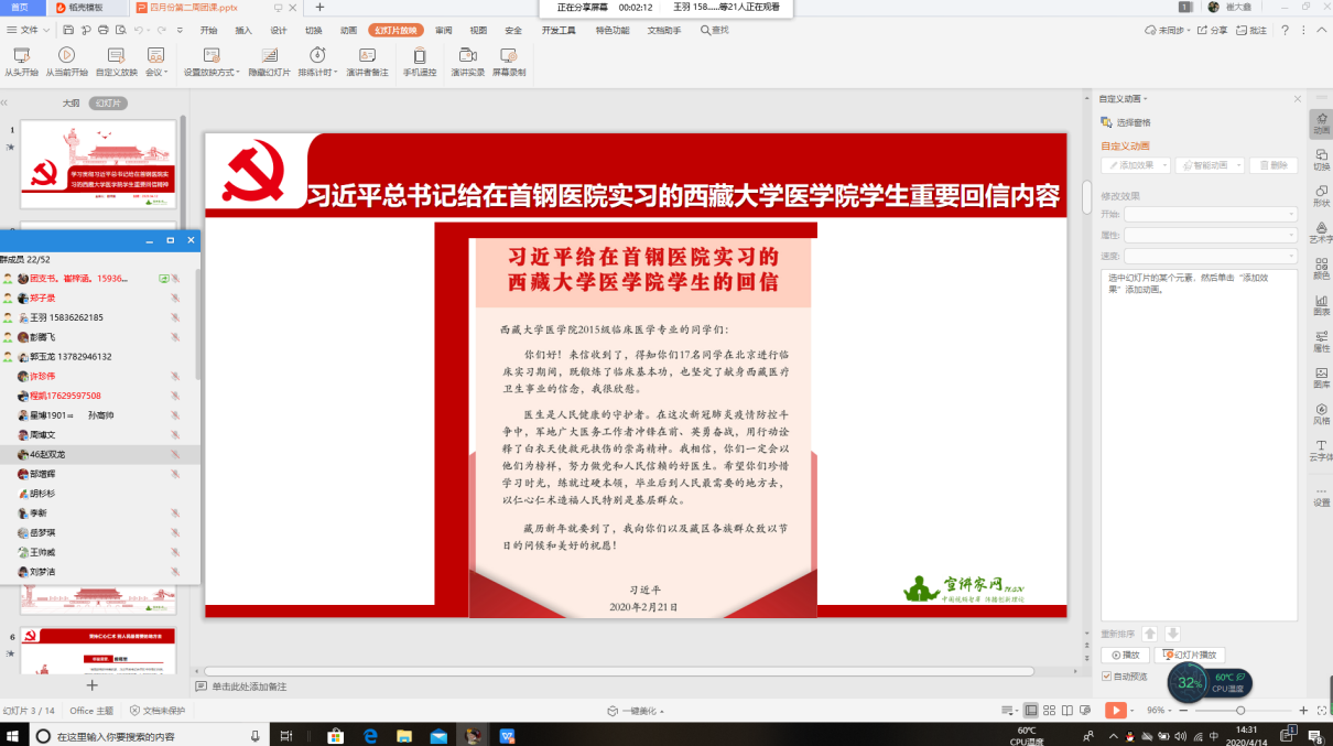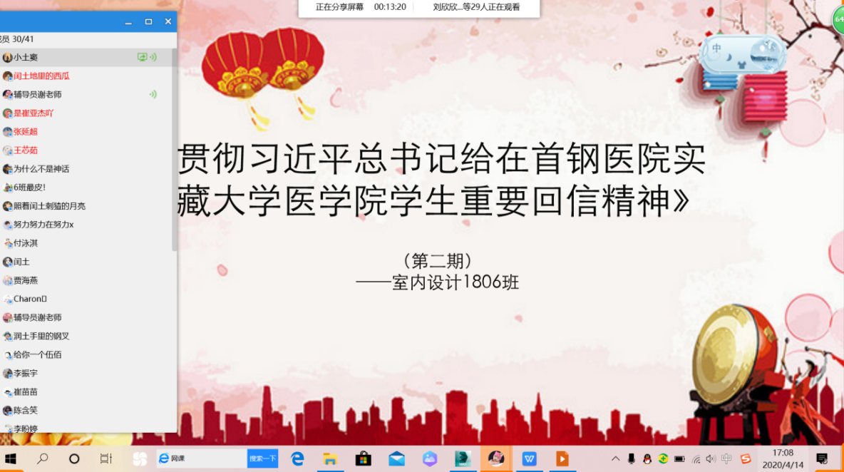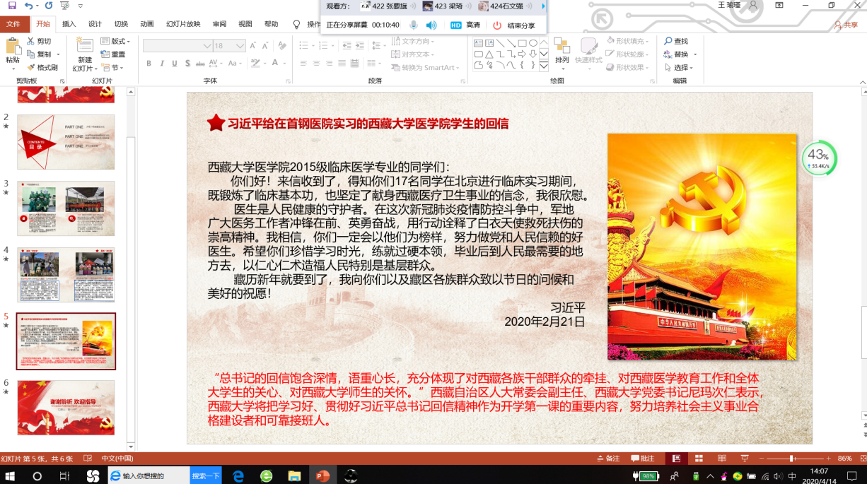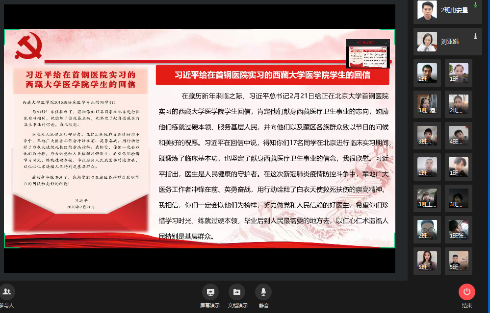 2020年4月13—16日,在建筑工程学院团总支的组织下,各团支部积极学习《习近平总书记给在北京大学首钢医院实习的西藏大学医学院学生的回信》,并以此为契机开展了网络青年团课集中学习。