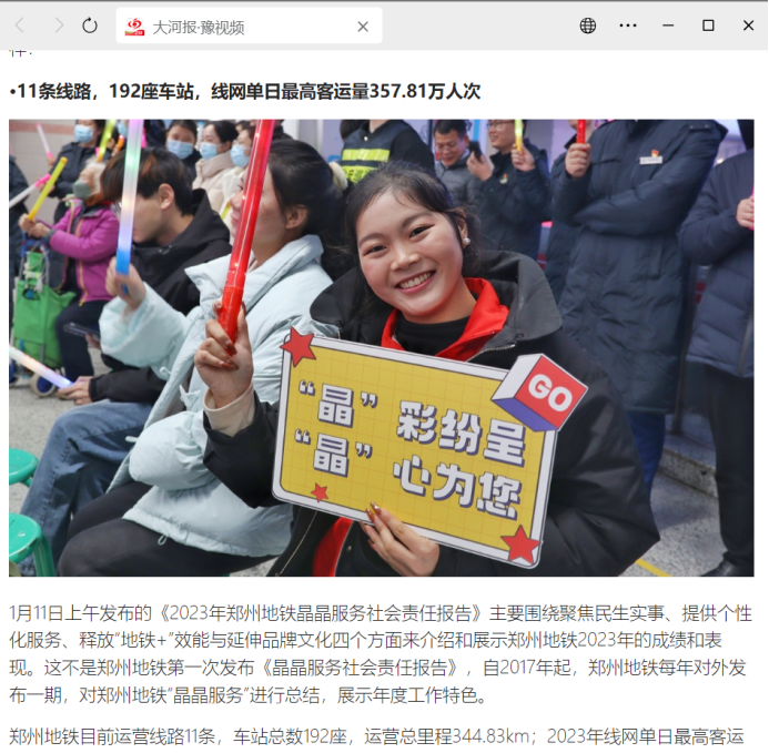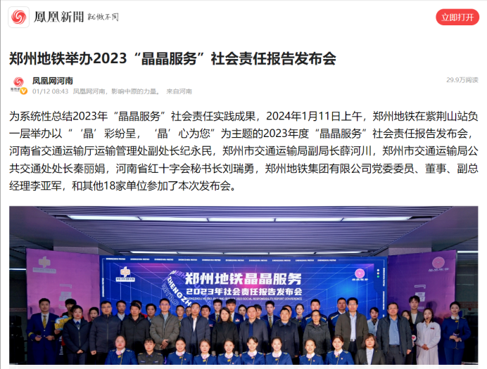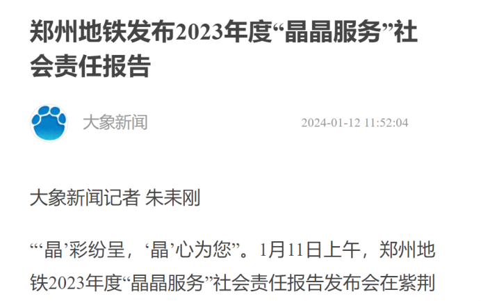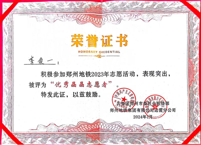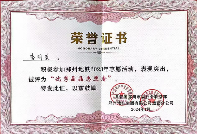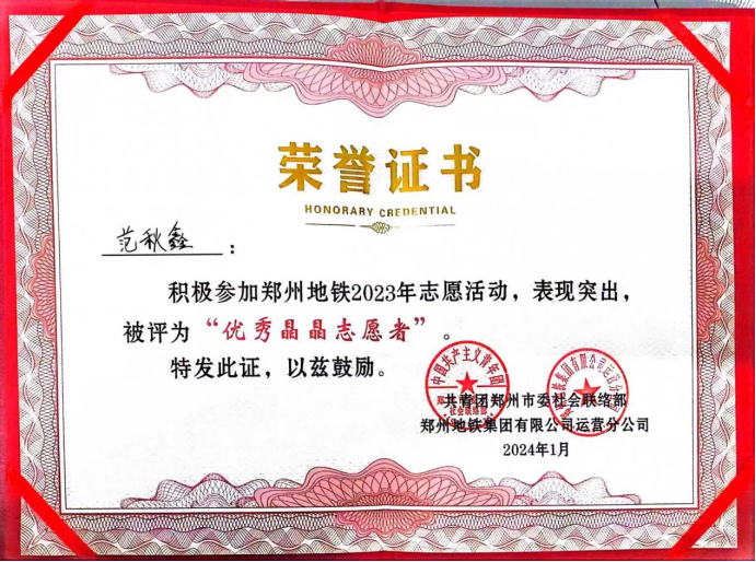 2024年1月11日上午,郑州地铁在紫荆山站负一层举办以“‘晶’彩纷呈,‘晶’心为您”为主题的2023年度“晶晶服务”社会责任报告发布会。我校建筑工程学院范秋鑫、李明真、李俊一三位同学被授予郑州地铁“优秀晶晶志愿者”称号。