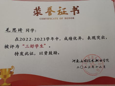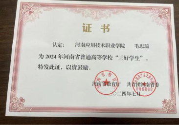 毛思琦,女,汉族,中共预备党员,2022级工程造价4班学生,在校期间担任造价2204班班长、建筑工程学院权益部副部长。曾荣获河南省省级三好学生,国家励志奖学金,校级一等奖学金,校级优秀学生干部等多项荣誉。