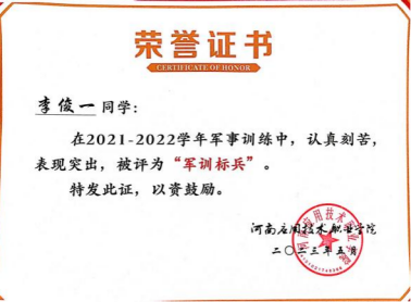 2023年05月,获得yl7703永利集团2023年度军训标兵