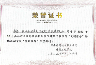 2023年11月,获得院级“优秀宿舍”荣誉称号