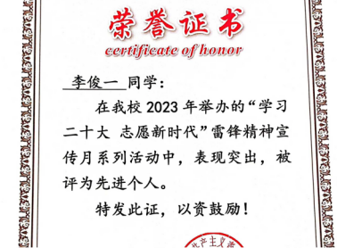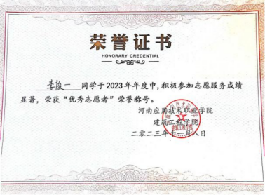 2023年10月,获得院级“优秀志愿者”荣誉称号