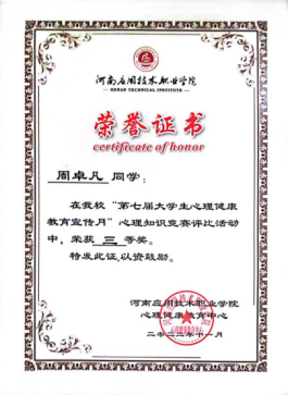 2022年11月荣获yl7703永利集团心理知识竞赛三等奖