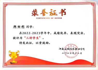 韩羽彤,女,汉族,中共预备党员,2022级造价2203班团支书。曾荣获第十八届全国高职院校“发明杯”大学生专利创新大赛一等奖、2023河南省“互联网+”大学生创新创业大赛河南赛区二等奖、校级一等奖学金、三好学生、军训标兵等荣誉。