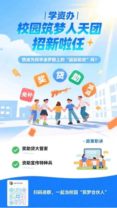校园筑梦人天团,招新啦!想成为同学逐梦路上的"超级助攻”吗?学资办一一校园「隐形守护者」用“奖、贷、助、补、减、免、偿”7大武器,织就资助安全网,让逐梦路上“一个都不能少”!