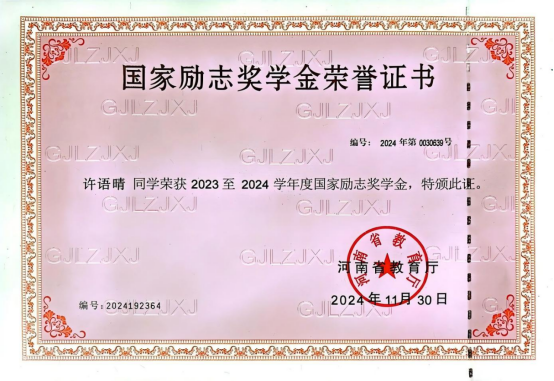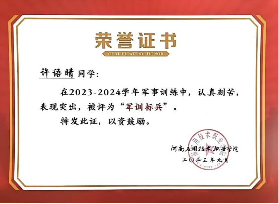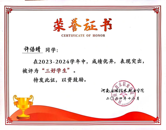 许语晴,女,汉族,河南郑州人,中共预备党员,yl7703永利集团建筑室内设计2304班学生,辅导员尹宇龙。连续两学年综合成绩班级第一,在校期间积极参与社会实践活动与校园文化活动,曾获得国家励志奖学金、全国高职院校“发明杯”大学生专利创新大赛、河南省创新创业大赛二、三等奖、三好学生等多项荣誉。