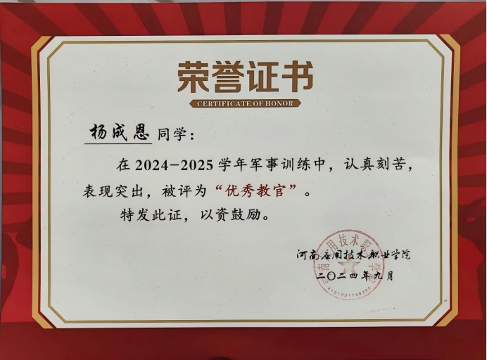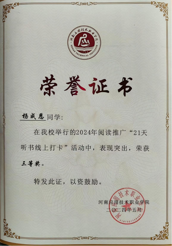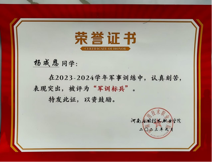 该生坚信“成长不止于书本,更在于躬身实践”,始终以志愿服务践行社会责任。作为学生会一员,积极参加志愿服务,可以在每一次的志愿活动中看到他的身影,他用实际行动彰显了一名青年志愿者的责任与使命。参加了开封第十一届运动会志愿活动、晖达社区、晖达书房、开封博物馆、郑开马拉松志愿者等志愿活动,用点滴行动诠释“奉献、友爱、互助、进步”的志愿精神,获评校级“优秀志愿者”。用真情传递大爱,用奉献诠释职责,用行动树立标杆。