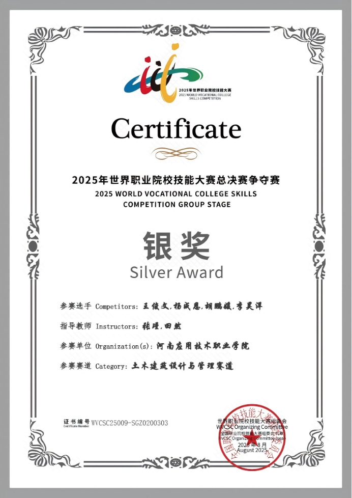 该生在校期间始终以高标准要求自己,在学业、实践与品德上全面发展。学业上,深耕专业知识,学习成绩加量化位列班级前茅,曾获得国家励志奖学金以及校级“三好学生”称号。暑假期间,参与2025年世界职业院校技能大赛总决赛争夺赛——土木设计与管理赛道的比赛,身为队长带领团队斩获银奖,体现出优秀的专业素养和扎实的基础。同时担任班级班长,带领班级共同进步,荣获“先进班集体”称号以及“书香班级”称号。该生身为学生会一员,始终秉持感恩之心,积极参与校园志愿活动,累计服务时长超100小时。为志愿服务做出突出贡献。理想仿若不灭灯塔,穿透前路的迷茫;奋斗犹如锋利船桨,划开征途的波澜。那些在书桌前熬过的深夜,在纸上画下的平面图,在挫折中重拾勇气的瞬间,都像细碎星光,慢慢拼凑出前行的方向。该生始终相信,每一次咬牙坚持都不会白费,每一回奋力奔跑都在靠近远方。青春的意义,正在于为热爱全力以赴,让梦想在汗水里绽放光芒,活成自己