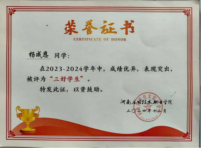 在学习上,该生始终秉持“勤耕不辍,笃行不怠”的态度,以目标为导向攻克学业难关。本学年专业成绩位列前茅,先后斩获2025年世界职业院校技能大赛总决赛银奖、校级“三好学生”,以及2023-2024年度国家励志奖学金等荣誉。