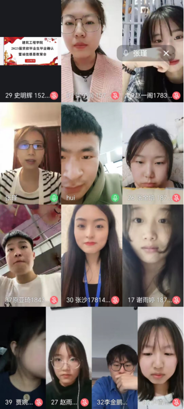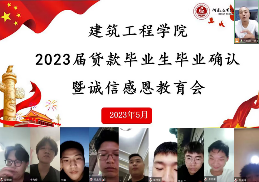 为加强学生诚信还贷的意识,鼓励更多贷款毕业生提前还款,做好国家助学贷款的贷后管理工作。2023年5月15日—19日,建筑工程学院组织2020级各班以线上形式召开了“毕业生诚信还贷”主题班会。