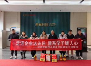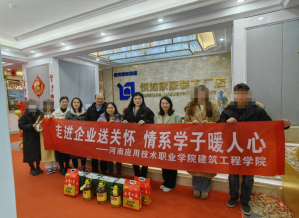 为进一步贯彻落实国家和学校资助政策,深入了解我院顶岗实习家庭经济困难学生的思想动态,工作与生活情况,传达学校和学院对顶岗实习学生的关怀,切实发挥资助育人实效,为学生办好实事。2024年1月23日—26日,建筑工程学院党总支书记张虎带队,党总支副书记刘亚娟,党政办主任李慧杰、资助专员张慧共同前往东易日盛、岳秀欣美装饰工程有限公司和河南森岸设计为正在顶岗实习的家庭经济困难学生送去学校的温暖和新春的祝福。
