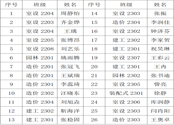 为深入贯彻落实习近平总书记关于加强新时代团员队伍先进性建设的重要指示,深入推进全面从严治团,优化团员队伍规模结构,提高发展团员工作质量。按照《共青团中央办公厅关于印发中国共产主义青年团发展团员工作细则的通知》(中青办发(2016〕11号)、《中国共产主义青年团章程》《2023年全省发展团员调控工作指引》等有关规定。现将拟新发展团员26人名单予以公示,若有问题和异议,可向建筑工程学院团总支反映。