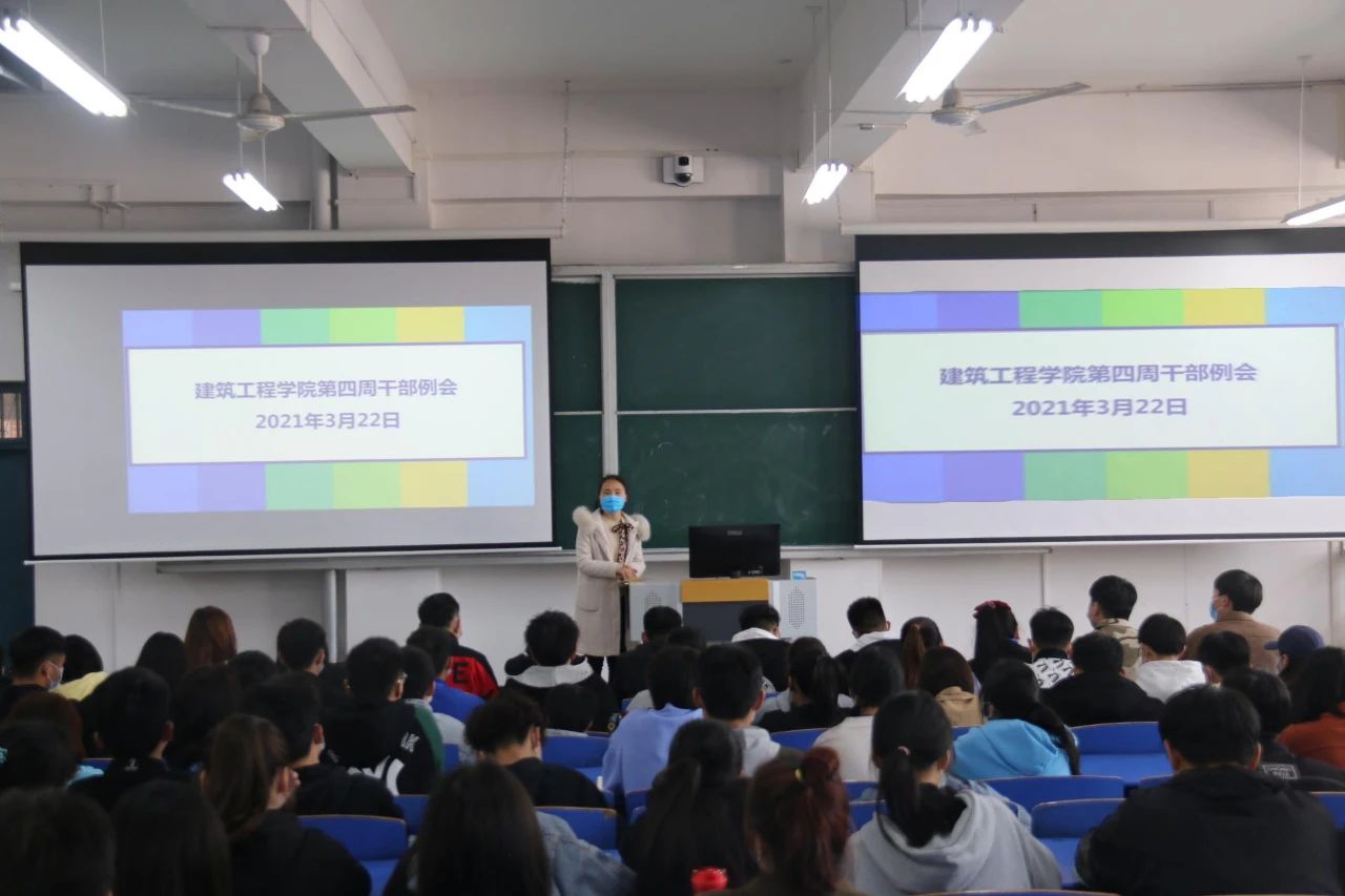 为提高小筑们的积极性,提升工作和学习的效率,建筑工程学院于2021年3月22日中午12:30,在B楼102教室召开了建筑工程学院第四周学生干部例会,(东校区以视频会议方式参加),参与本次会议的有刘高喜老师、李慧杰老师、孙雪理老师、团学会全体成员、入党积极分子及各班班长、团支书。会议开始,刘高喜老师强调,春季是流行病高发季节,大家要多参加校园活动,多锻炼,提高自身素质,宿舍要保持内务整洁,及时通风,预防传染性疾病发生。